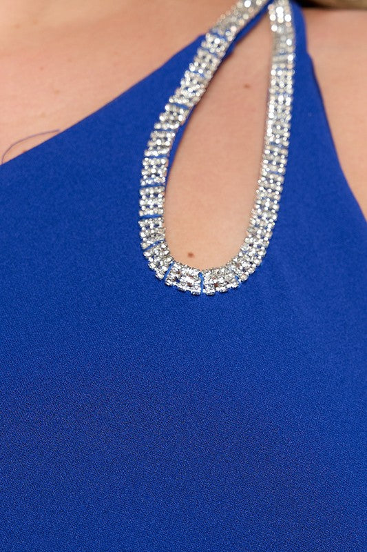 One Shoulder Cutout * Rhinestone Trim * Open Back * Back Zipper Closure