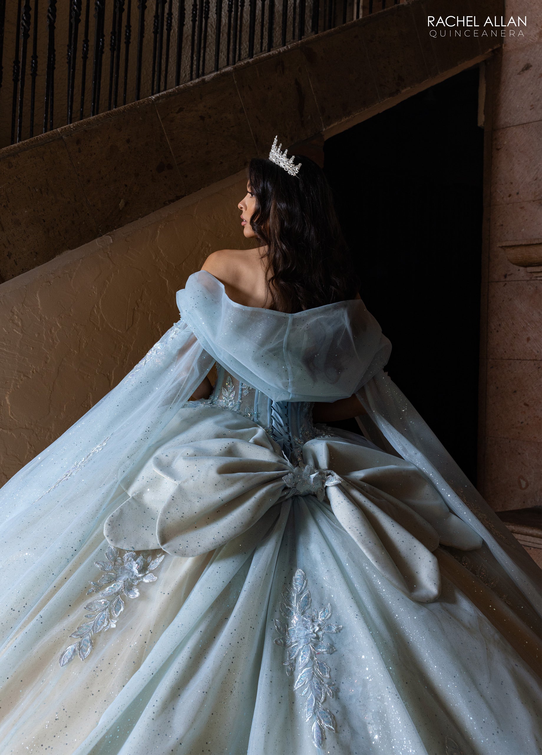 adiate princess charm in this breathtaking ballgown, adorned with sparkling beading, pastel appliqué, and delicate 3D flowers. The glitter tulle skirt flows into a dreamy detachable train, complete with a sculpted bow and sheer detachable sleeves for ultimate drama. A flawless choice for quinceañeras or fantasy celebrations.