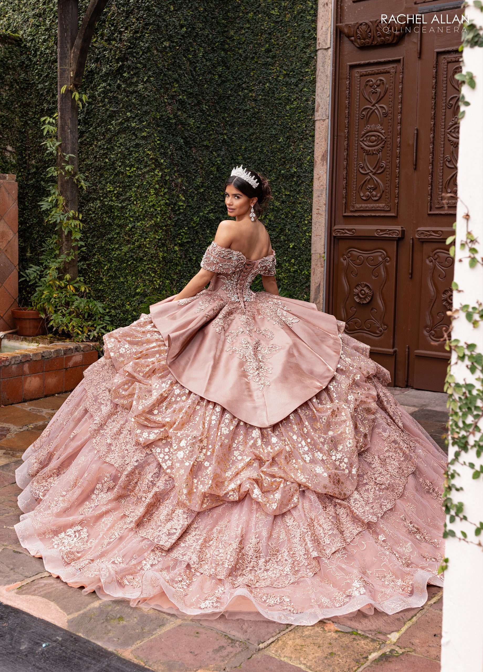 This showstopping gown features tiered glitter tulle, crystal satin panels, and radiant beading across a regal off-shoulder neckline. The dramatic layered skirt adds volume and flair, making it a perfect choice for quinceañeras, galas, and statement-making entrances.